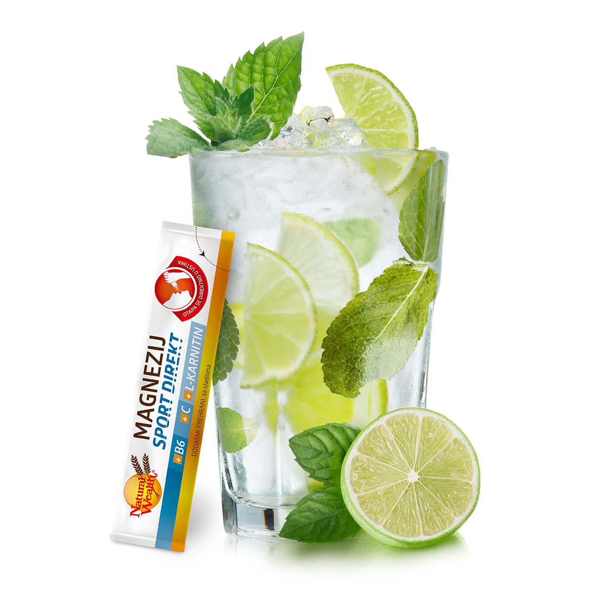 Limetu, par listića metvice, žličicu meda staviti u čašu i sve zaliti mineralnom vodom. Na kraju dodati 1 vrećicu Natural Wealth® Magnezij Sport Direkt i led te sve skupa dobro promiješati. Ovaj napitak idealan je kao osvježenje nakon napornog treninga.